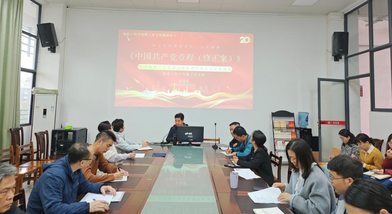 为深入学习贯彻党的二十大精神,切实统一支部党员思想行动,准确把握新修订《中国共产党章程》的核心要义与实践要求,12月23日下午,智能工程学院教工党支部在5训308召开党员大会,集中学习新修订的《中国共产党章程》。党支部书记朱国勇主持学习并作专题解读,系统梳理党的二十大对党章作出的十二处修正要点,逐一阐释...【查看详情】