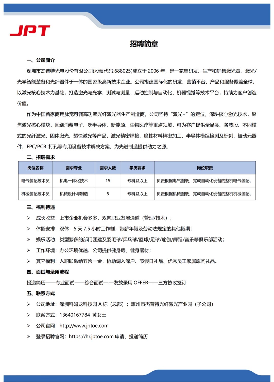 深圳市杰普特光电股份有限公司招聘简章