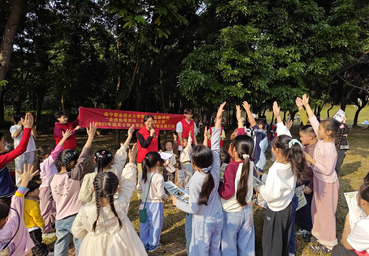 12月21日,南宁职业技术大学智造生态宣讲团走进狮山公园,开展国家公园科普宣教志愿服务活动。活动紧扣“守护国家公园青春行动”号召,将生态科普融入市民休闲场景,以青春力量助力生态文明建设,是2025年全国大学生国家公园科普宣教志愿行动的生动实践。