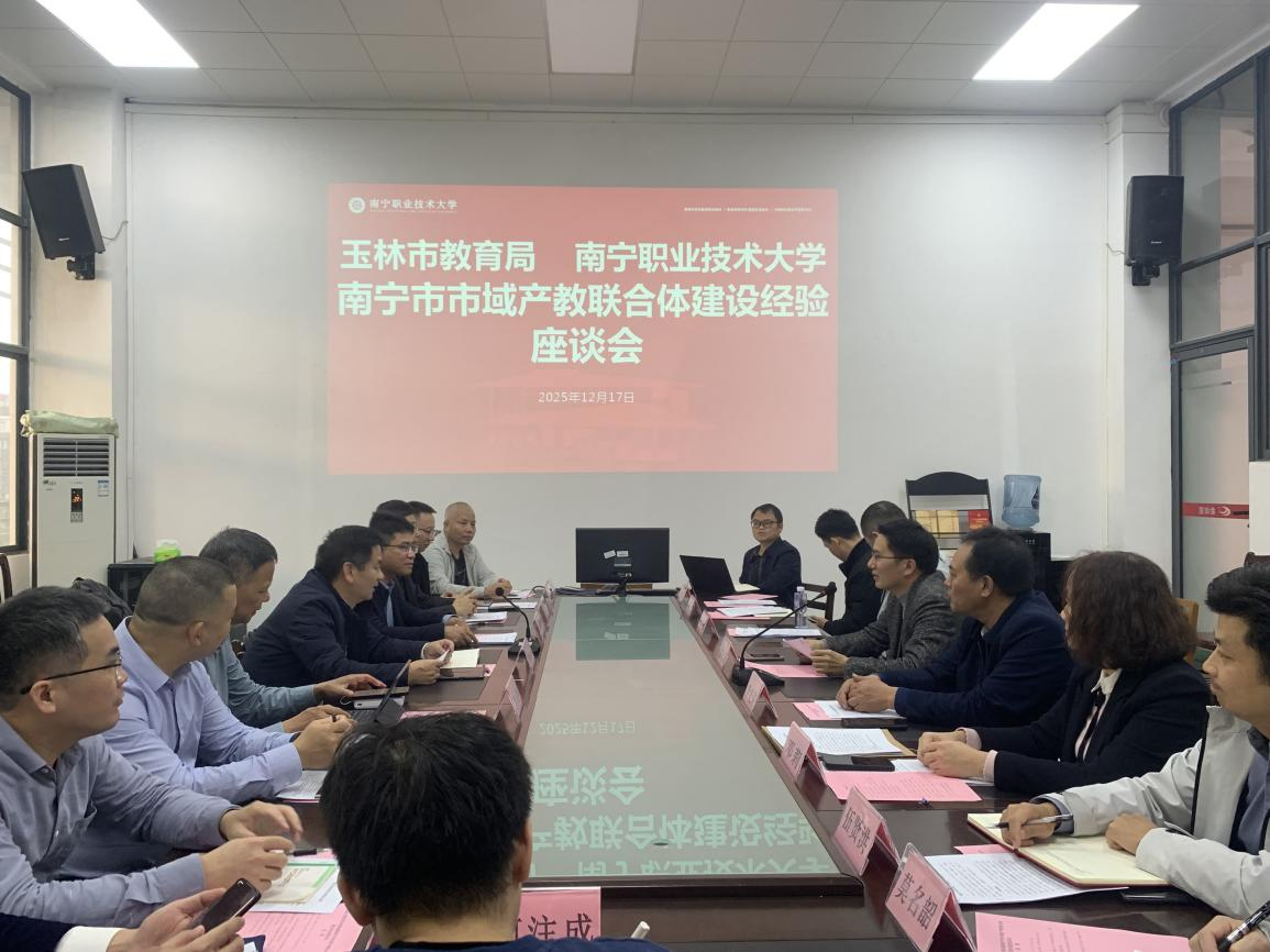 12月17日,玉林市教育局党组成员、总督学张力率队到南宁职业技术大学智能工程学院,专题考察调研南宁市市域产教联合体建设经验。南宁市教育局四级调研员林文辉,学院党委书记李光荣,院长张叶茂,副院长伍贤洪及相关科室、专业群与团队负责人陪同调研并参加座谈。