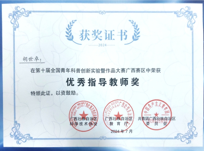 胡世卓荣获第十届全国青年科普创新实验暨作品大赛广西赛区“优秀指导教师奖”