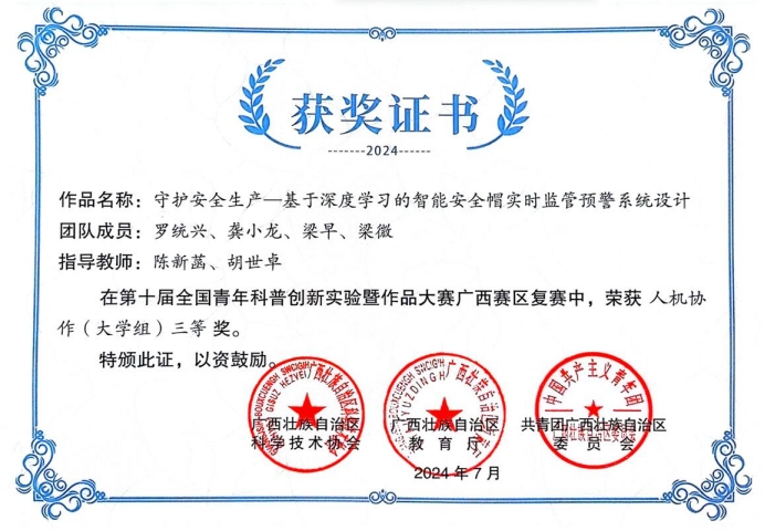 胡世卓指导学生参加第十届全国青年科普创新实验暨作品大赛荣获广西赛区三等奖