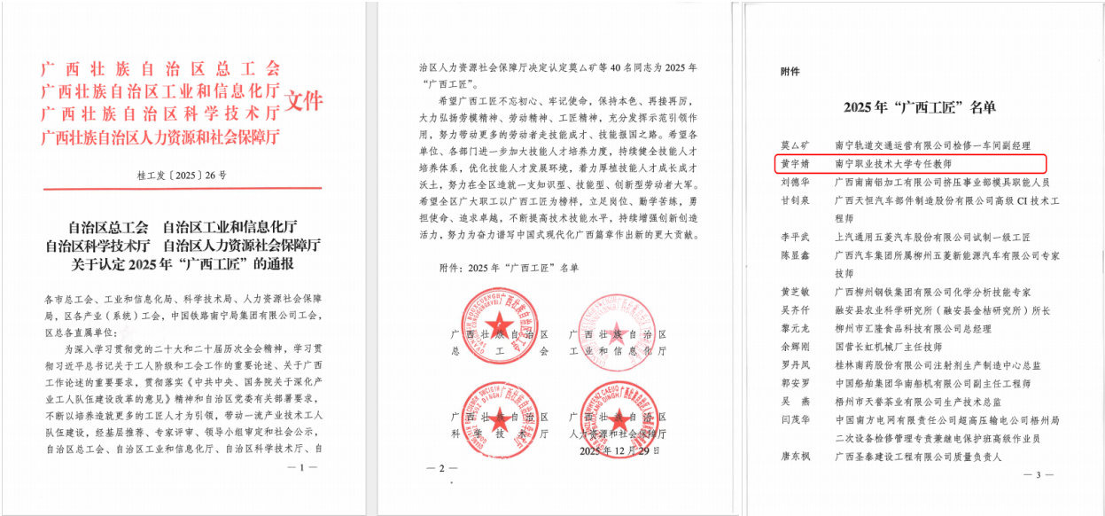 近日,自治区总工会、工业和信息化厅、人力资源社会保障厅、科学技术厅联合发布通报,认定2025年“广西工匠”名单。智能工程学院黄宇婧副教授光荣入选。这既是对黄宇婧副教授技能报国坚实足迹的铭刻,也是对我院“双师型”教师队伍建设成效的生动注脚。