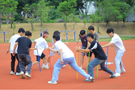 活动现场气氛热烈,在团支部委员的统筹安排下,同学们被分为4个小组,依次参与“不倒森林”“前行万里”等经典素拓项目。“不倒森林”中,大家手举长杆围成圆圈,需在保持杆身直立的同时快速移动换位,任何一人失误都会导致“森林倒塌”;“前行万里”环节更具挑战性,每组同学手持U型板依次排开,通过精准传递让小球沿着U型板的凹槽从起点“前进”到终点。大家围在一起讨论传球节奏,及时提醒队友调整姿势,失误时互相鼓励,成功时齐声欢呼。“原来一个小小的传球都需要所有人配合,这种齐心协力的感觉特别棒!”参与活动的覃同学说。