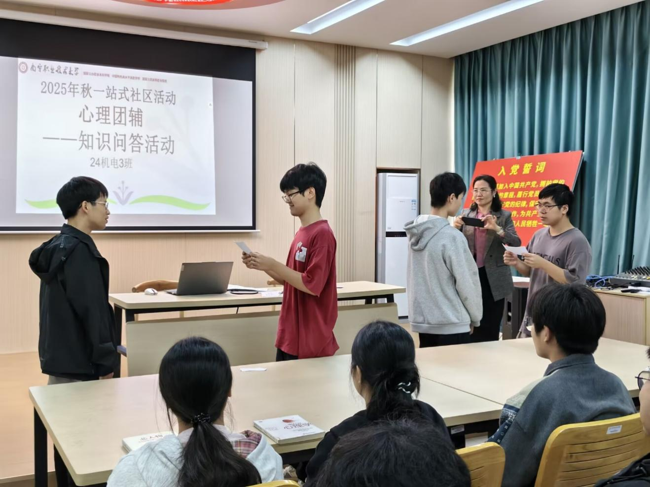 10月30日,2024级机电3班全体学生在辅导员钟洁琳老师的带领下,在学校一站式社区新格物辅导员工作室开展心理团辅活动。本次活动以“关爱心灵成长,凝聚班级温情”为主题,通过心理知识问答与“你划我猜”趣味游戏相结合的形式,帮助同学们缓解学习压力,提升心理健康素养,增进同学间的情感联结。