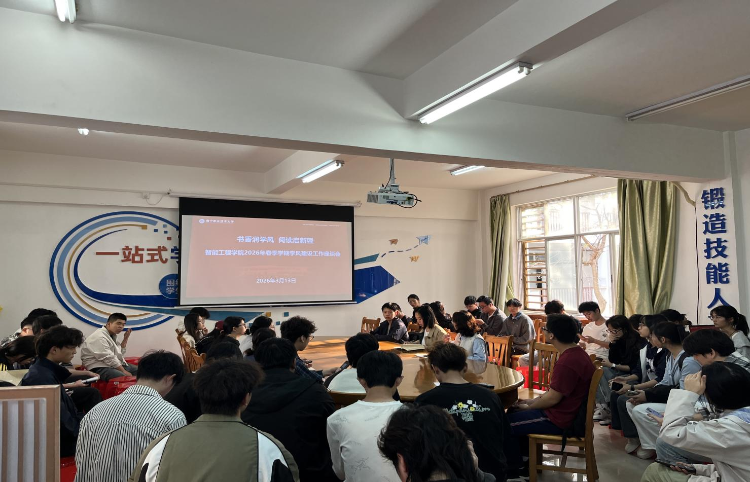 3月13日,智能工程学院在12栋一站式学生社区召开2026年春季学期学风建设工作座谈会。学院党委副书记、纪委书记黄小钊,专职辅导员钟洁琳,以及学院团委素拓部、各班第二课堂负责人参与本次会议。