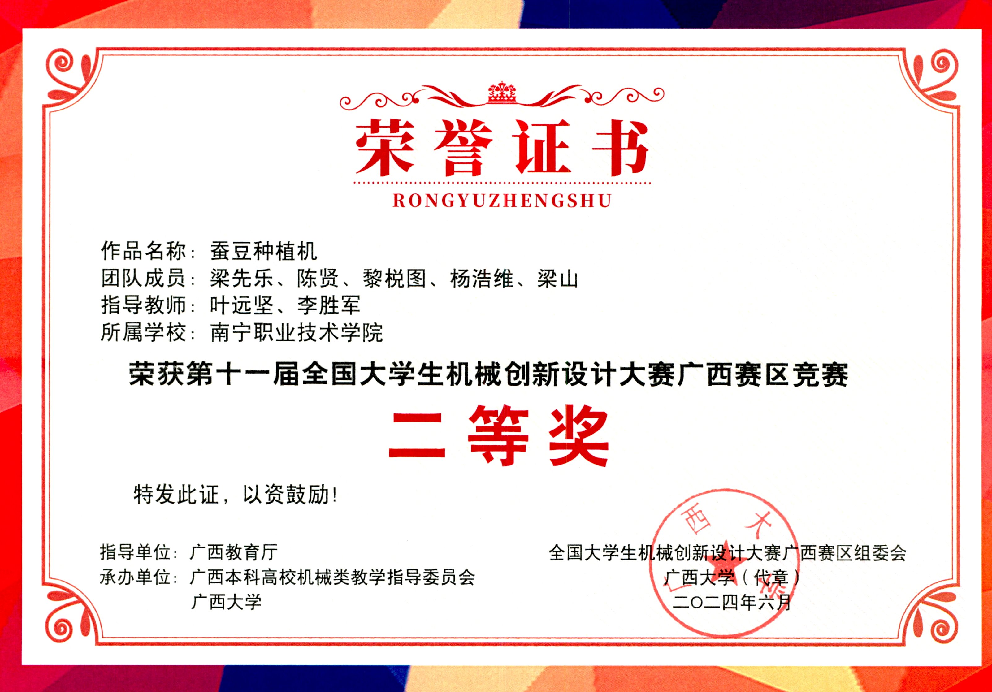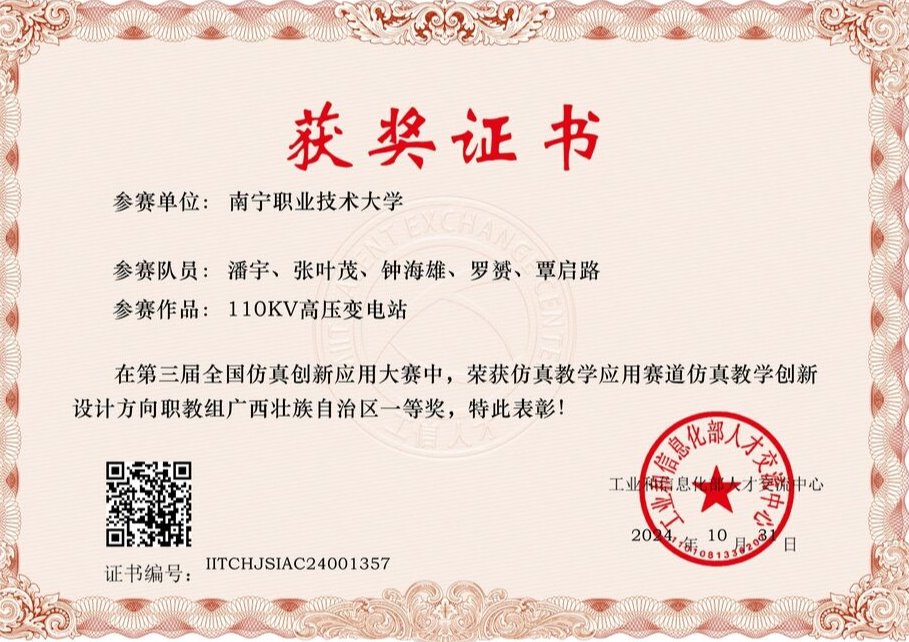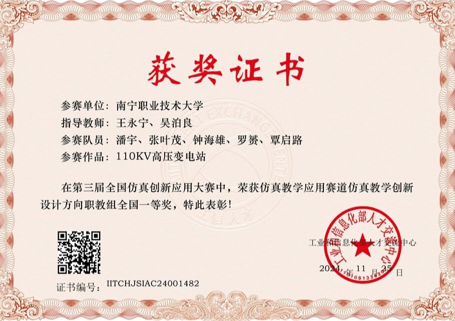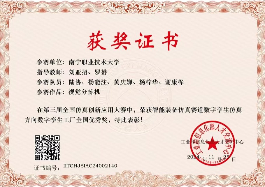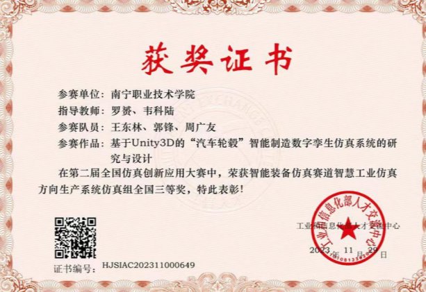 近年,我校获得教育部组织的高职院校技能大赛-机器人应用赛项广西区一等奖,连续3年获得全国机器人竞赛三等奖。2023年获第二届全国技能大赛工业机器人系统操作(双人)项目银牌,2023年获第九届中国国际互联网+大学生创新创业大赛广西赛区选拔赛银奖,2024年广西职业院校技能大赛高职组机器人系统集成应用技术赛项三等奖。